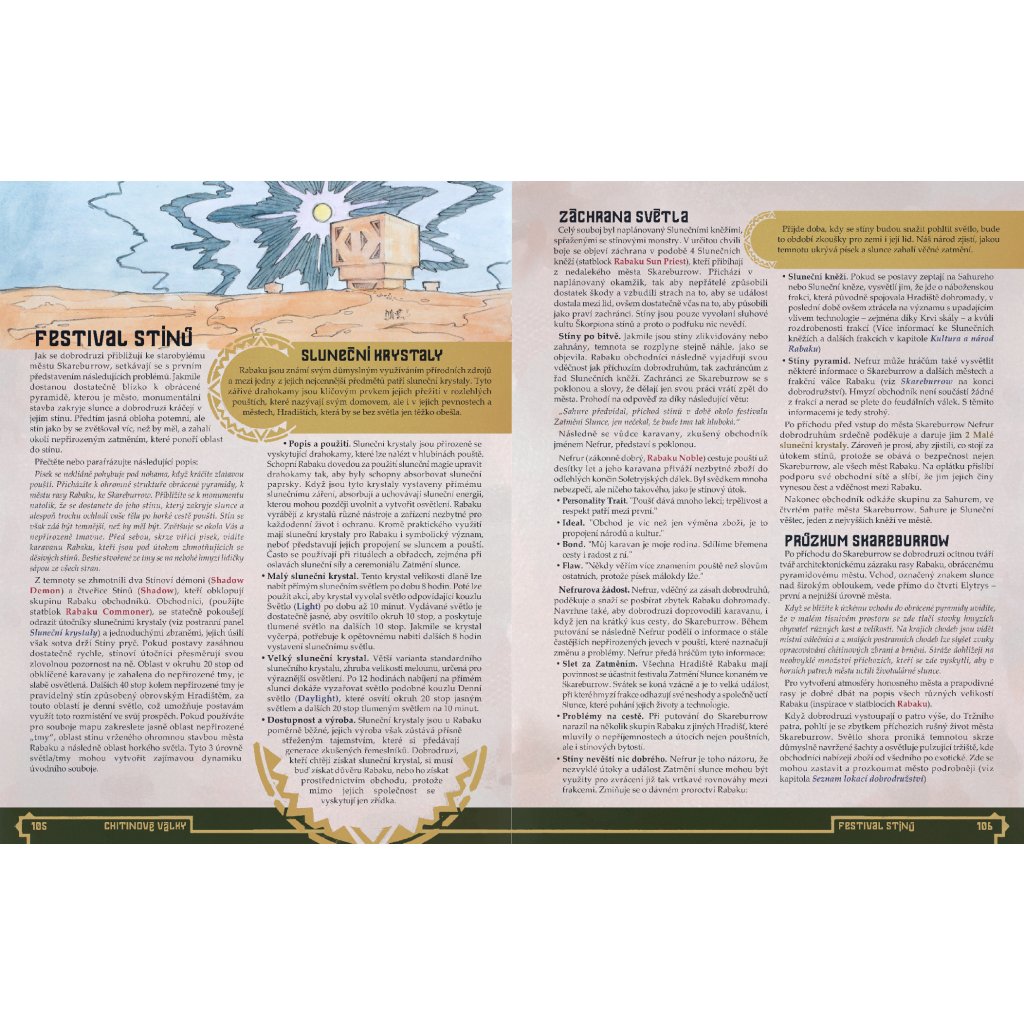 Velkou poušť si však podmanit nelze – spalující žár, Černé bouře smrti, rozvrácené živly a mocní duchové a džinové jsou jen zlomkem nástrah, které se v ní skrývají. Pokud chcete nebezpečí Velké pouště zdolat a najít bájná bohatství, která se v jejích hlubinách ukrývají, musíte se nejprve připravit – nic vás však nepřipraví lépe, než příběhy těch, kteří přišli před vámi – příběhy zapsané v Kronice Velké pouště.